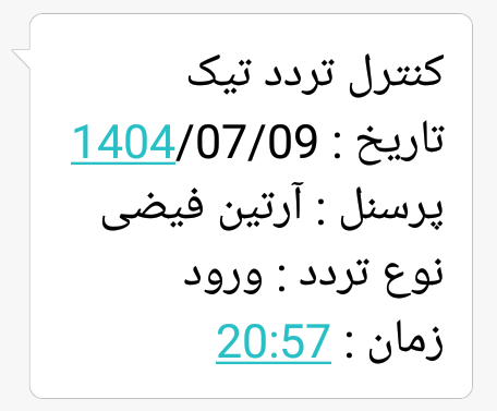 نرم افزار کنترل تردد تیک از طریق ارتباط با دستگاه حضور و غیاب، پس از ثبت تردد، آن را برای شما پیامک می کند،